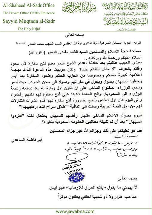 وقال الصدر في رد على سؤال حول موقف المالكي "المتناقض" من السعودية قبل وبعد خروجه من رئاسة الحكومة "لا يهمني مايقول [بائع العراق للأرهاب] فهو ليس صاحب قرار ولا ذو شعبية لكي يكون مؤثراً".