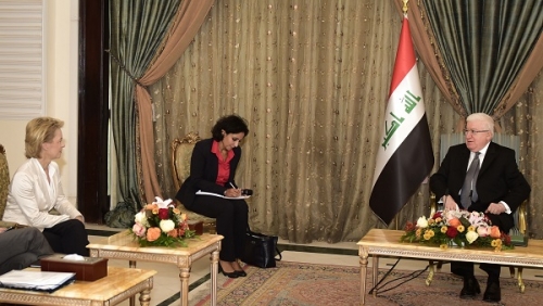 وذكر بيان رئاسي تلقت وكالة انباء براثا نسخة منه ان "رئيس الجمهورية فؤاد معصوم استقبل اليوم الخميس في قصر السلام ببغداد وزيرة الدفاع الألمانية، وتمت خلال اللقاء مناقشة آخر المستجدات على الصعيدين الامني والسياسي والتحضيرات لمعركة الموصل القادمة وضرورة تعميق التعاون المشترك بين العراق والتحالف الدولي وبضمنه المانيا لدحر تنظيم داعش الارهابي.