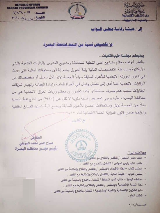 أعلن رئيس مجلس محافظة البصرة، صباح البزوني، عن ارسال كتاب رسمي الى هيئة رئاسة مجلس النواب، لغرض تخصيص نسبة مئوية لاتقل عن 10% من ايرادات إنتاج نفط المحافظة إلى حكومة البصرة، بدلاً من مبالغ الخمسة دولار واستحقاقات الأعوام السابقة التي لم تتسلمها المحافظة.