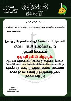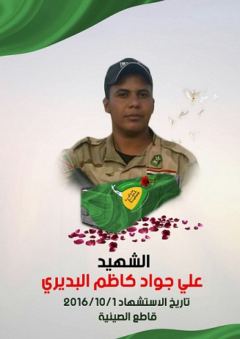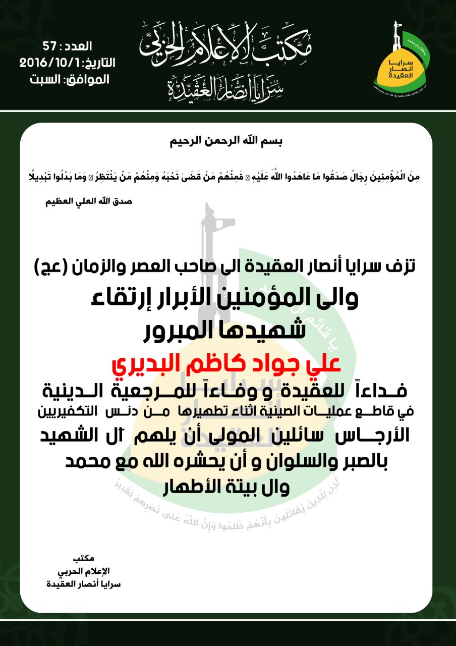 وقال بيان صادر عن مكتب الاعلام الحربي التابع للسرايا تسلمت وكالة انباء براثا نسخة منه تزف سرايا انصار العقيدة الى صاحب العصر والزمان (عج) والى المؤمنين الأبرار إرتقاء شهيدها المبرور علي جواد كاظم البديري فداءاً للعقيدة و وفاءاً للمرجعية الدينية في قاطع عمليات الصينية اثناء تطهيرها من دنس التكفيريين الأرجاس سائلين المولى ان يلهم ال الشهداء بالصبر والسلوان وأن يحشره الله مع محمد وال بيتة الاطهار