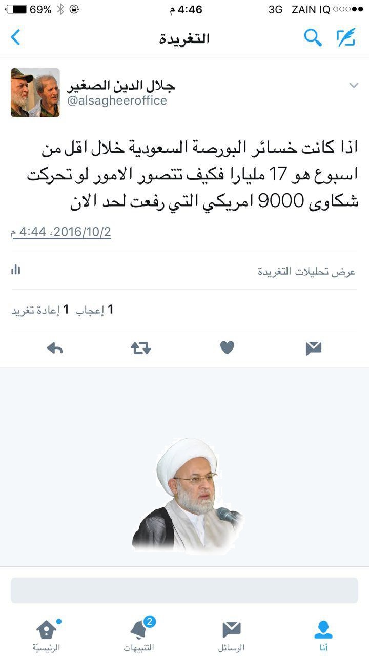 تسائل سماحة الشيخ جلال الدين الصغير في تغريدة له: إذا كانت خسائر البورصة السعودية خلال اسبوع هو 17 مليار دولار، فكيف تتصور الأمور أذا تحركت شكاوى 9000 امريكي التي رفعت حتى الآن..!