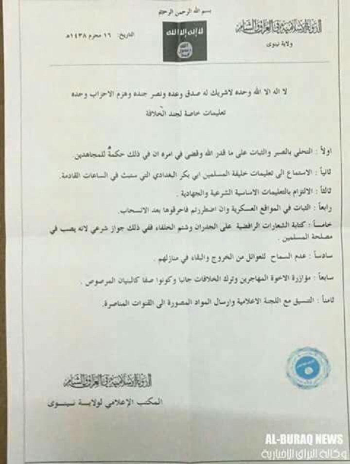 ودعا التنظيم الارهابي الى الالتزام بما اسماه بالتعليمات الاساسية الشرعية والجهادية وطالب التنظيم الارهابي بالثبات في المواقع العسكرية واذا اضطروا الى الانسحاب فيجب حرق هذه المواقع وكتابة شعارات على الجدران تشتم فيها الخلفاء الراشدين