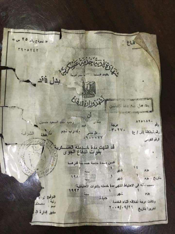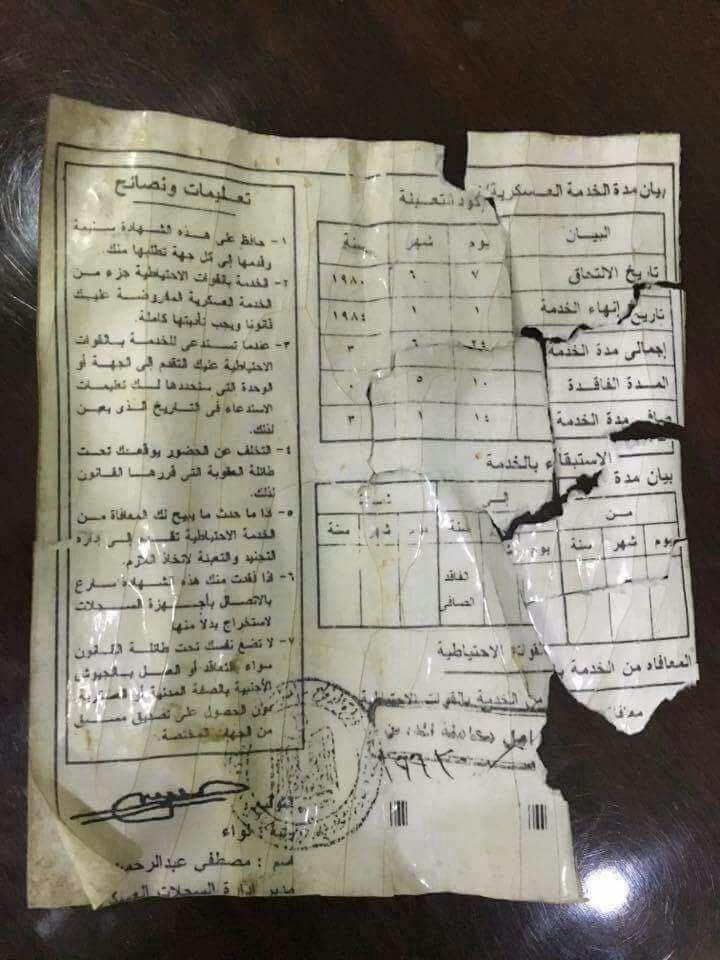 6 _ الحشد الشعبي: بالصور بقايا الانتحاري المصري الذي حاول استهداف قوات الحشد الشعبي في جنوب الموصل ، وثيقة الخدمة العسكرية في الجيش المصري .