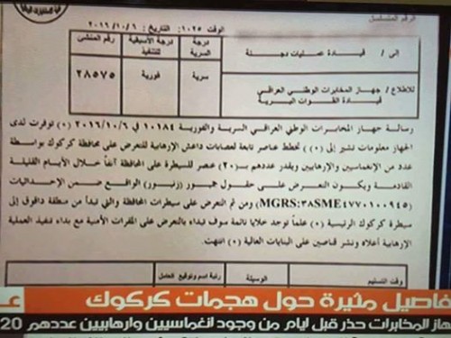 وقال توران في حديثصحفي تابعته وكالة انباء براثا إن "المخابرات العراقية اعطت معلومات بتاريخ 6 من الشهر الحالي، بكتاب رسمي الى رئيس الاجهزة الامنية بمحافظة كركوك اي المحافظ، وكذلك لمديرية شرطة كركوك، بأن مجموعات ارهابية من داعش ستتسلل الى المدينة لإحداث بلبلة فيها".