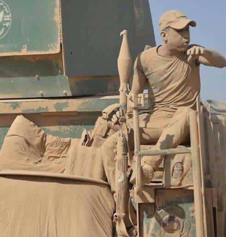 صورة لأحد مقاتلي العراق البواسل الذين يخوضون معركة العز والكرامة؛ معركة تحرير الموصل..تستحق أن تخلد ويحولها احد النحاتين المحترفين الى نصب تذكاري