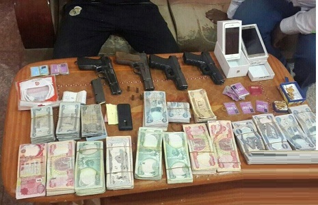 وقال مصدر امني ان المتهم البالغ من العمر 39 عاما يسكن ناحية العكيكة وقد ضبطت بحوزته مبالغ مالية ومصوغات ذهبية ومسدسات وهواتف نقالة وكارتات تعبئة كانت مخبئة في داره.