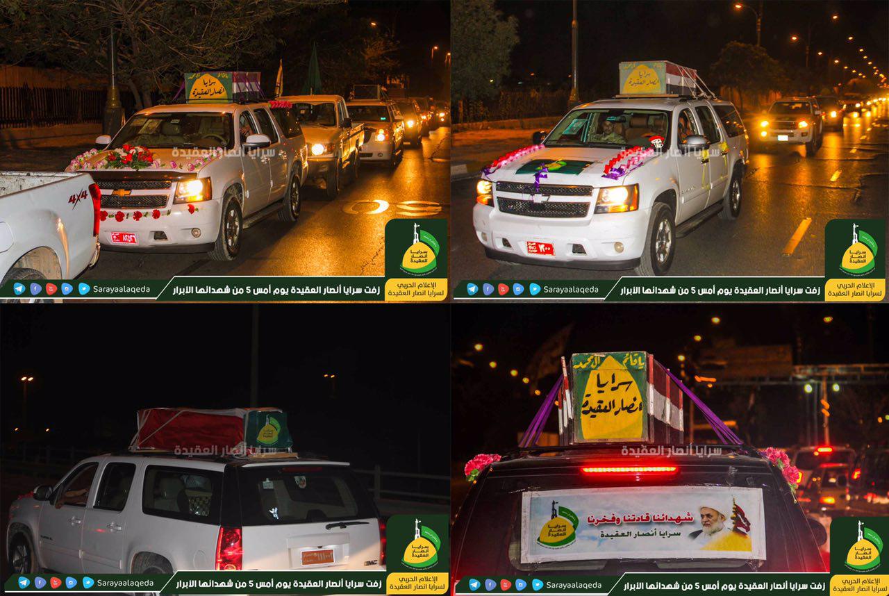 زفت سرايا أنضار العقيدة يوم أمس ٥ من شهدائها الأبرار الذين استشهدوا فداءاً للعقيدة و وفاءاً للمرجعية الدينية الرشيدة في عمليات تحرير قرية ام العظام في جنوب غرب الموصل بعد استهدافهم من قبل سيارة مفخخة ولولا تضحيات الأبطال الخمسة لكان عدد الشهداء أكبر من هذا العدد .. حيث شيعت مدينة بغداد يوم أمس مساءاً الشهداء بحضور شعبي واسع من ذوي الشهيد ومنتسبين السرايا والشهداء السعداء هم كل من :