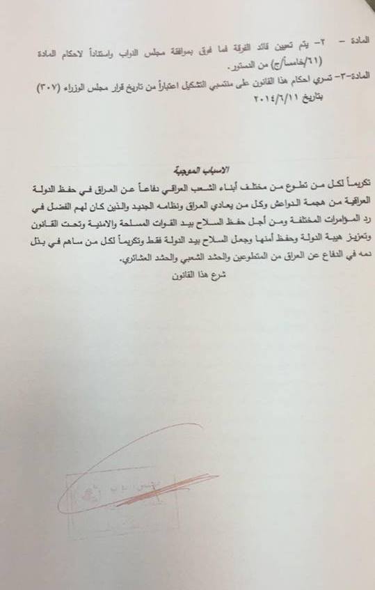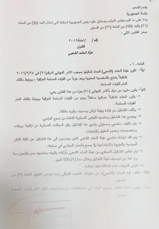 تنشر وكالة انباء براثا نص قانون الحشد الشعبي الذي صوت البرلمان عليه خلال جلسة اليوم،