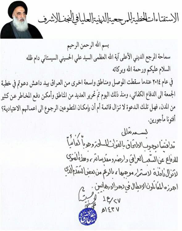 ووجه احد مقلدي الامام المفدى السيد السيستاني سؤالا بقوله، إنه في عام 2014 عندما سقطت الموصل ومناطق واسعة اخرى من العراق بيد "داعش" دعوتم في الجمعة الى الدفاع الكفائي، ومنذ ذلك اليوم تم تحرير العديد من المناطق وامكن دفع المخاطر عن كثير من المدن، فهل تلك الدعوة ماتزال قائمة ام ان بإمكان المتطوعين الرجوع الى اعمالهم الاعتيادية؟.