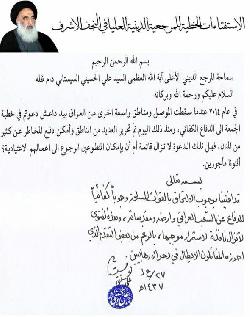 يشار الى ان المرجعية الدينية المباركة دعت في (13 حزيران 2014)، القادرين على حمل السلاح ومقاتلة "الإرهابيين" إلى التطوع للانخراط في صفوف القوات الأمنية، عقب سيطرة تنظيم "داعش" الارهابي على مدينة الموصل ومساحات واسعة من صلاح الدين وديالى بسبب سياسات نوري المالكي الفاشلة انذاك ، فيما طالبت بتكريم الضباط الذي "ابلوا بلاءً حسنا".