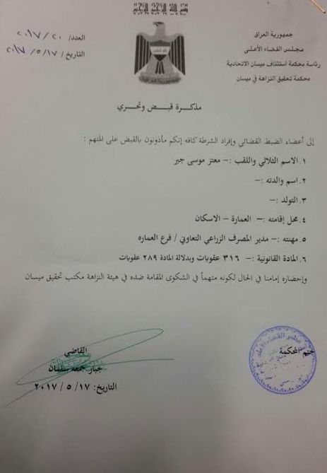 أعلنت لجنة النزاهة في مجلس محافظة ميسان، اليوم الاربعاء، عن صدور امر قبض بحق مدير مصرف الزراعي السابق اثر شكاوى قدمت ضده.