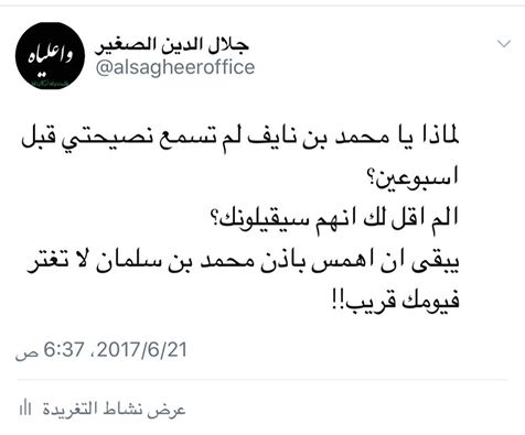 كتب امام جامع براثا الشيخ جلال الدين الصغير في صفحته الشخصية على تويتر معقبا على اقالة ولي العهد السعودي محمد بن نايف وقال له لماذا يا محمد بن نايف لم تسمع نصيحتي قبل اسبوعين ؟؟ الم اقل لك انهم سيقيلوك ؟؟ واضاف سماحته يبقى ان اهمس باذن محمد بن سلمان لا تغتر فيومك قريب