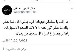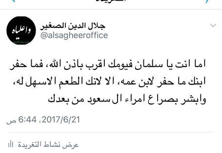 ووجه سماحته في تغريدة اخرى كلامه الى الملك السعودي وقال له (( اما انت يا سلمان فيومك اقرب باذن الله , فما حفر ابنك ما حفر لابن عمه الا لانك الطعم الاسهل له وابشر بصراع امراء ال سعود من بعدك ))