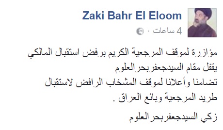 وقال السيد زكي بحر العلوم نجل السيد جعفر بحر العلوم في صفحته بموقع التواصل الاجتماعي {فيسبوك} اليوم الثلاثاء "مؤازرة لموقف المرجعية الكريم برفض استقبال المالكي، يُقفل مقام السيد جعفر بحرالعلوم، تضامنا وأعلانا لموقف المشخاب الرافض لاستقبال طريد المرجعية وبائع العراق" بحسب قوله.