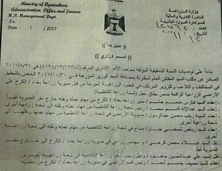تبين وثيقة صادرة عن لجنة النزاهة البرلمانية ان رئيس لجنة النزاهة النيابية طلال الزوبعي، وجه كتاب شكر إلى أربعة موظفين سبق وان اتهموا بسرقة الأراضي الزراعية في بغداد وبيعها على عدد من الشخصيات والمسؤولين، وأحيلوا إلى التحقيق من قبل مفتشية وزارة الزراعة وتم اعفائهم من مناصبهم !!