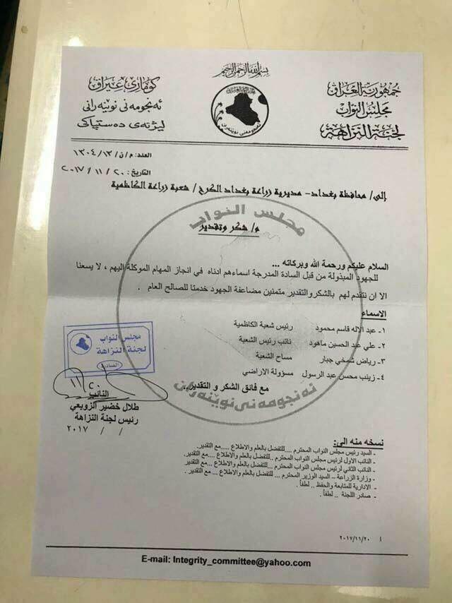 والسؤال هو لماذا يقوم رئيس لجنة النزاهة طلال الزوبعي بتوجيه كتاب شكر لهؤلاء السراق فاين النزاهة رئيس النزاهة !!!!؟؟؟
