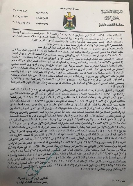 واضاف ان "المحكمة قررت إعادته الى مناصبه والزام تمكينه من ممارسه أعماله مستشاراً للامن الوطني ورئيساً لهيئة الحشد الشعبي ورئيساً لجهاز الأمن الوطني".