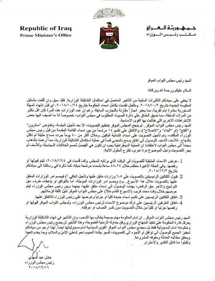 وهذا  نص الرسالة التي بعثها عبد المهدي الى الحلبوسي بشأن الوزارات الشاغرة: