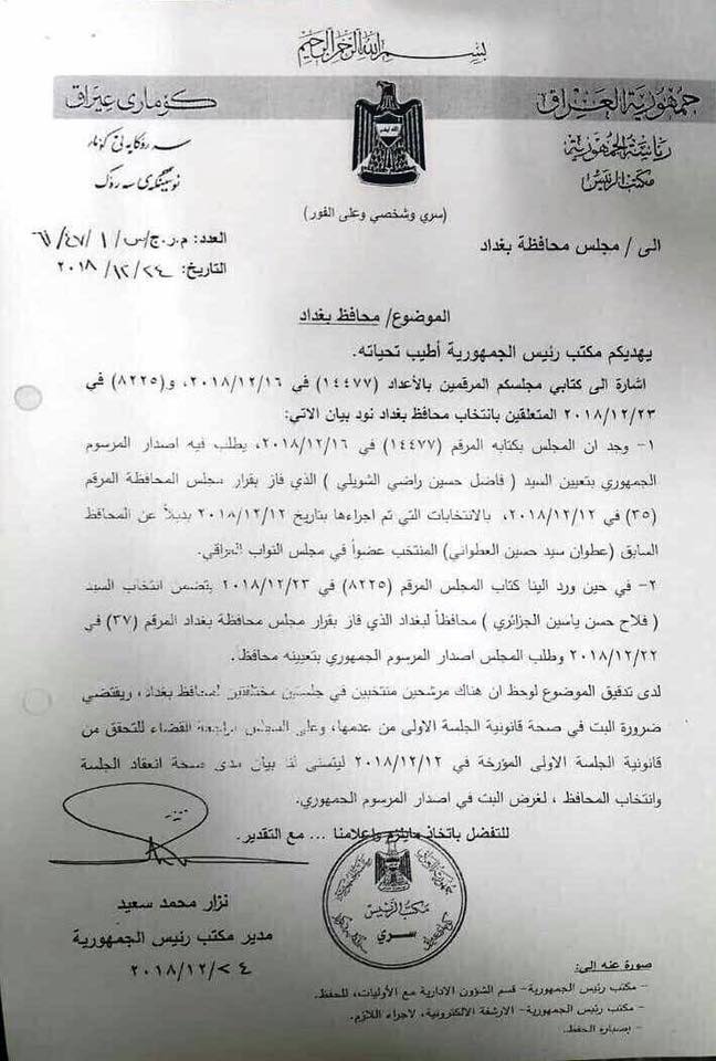 نشرت وثيقة صادرة من رئاسة الجمهورية وموجهة الى مجلس محافظة بغداد تتضمن عدم مصادقة الرئاسة على محافظ بغداد فلاح الجزائري، الا بعد البت من القضاء في صحة وقانونية الجلسة الاولى التي أُختير فيها فاضل الشويلي محافظا.