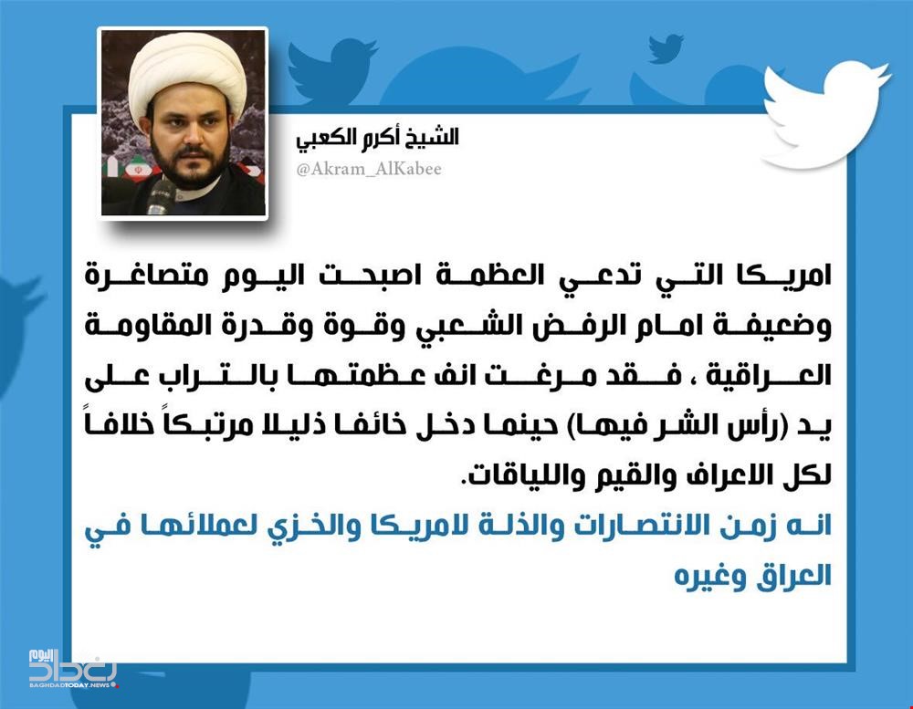 وذكر الكعبي في تغريدة على موقعه تويتر أن "اميركا التي تدعي العظمة، أصبحت اليوم متصاغرة وضعيفة امام الرفض الشعبي وقوة وقدرة المقاومة العراقية".
