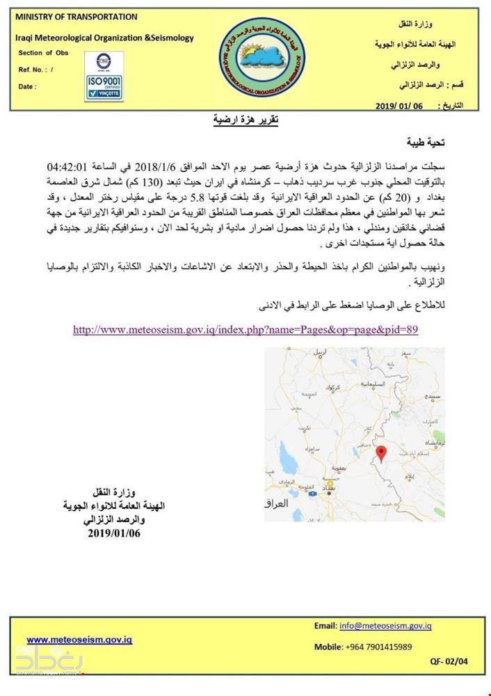 وذكر اعلام وزارة النقل، في بيان ان "مراصد الهياة العامة للأنواء الجوية والرصد الزلزالي سجلت حدوث هزة أرضية الساعة 4.42 مساءً، في جنوب غرب سرديب ذهاب كرمنشاه تبعد 130كم عن شمال شرق بغداد".