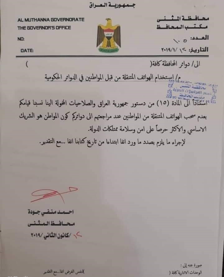 اصدر محافظ المثنى أحمد منفي جودة، قراراً يمنع فيه سحب الهواتف المتنقلة من المواطنين عند مراجعتهم إلى دوائر المحافظة.