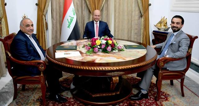وقالت رئاسة الجمهورية في بيان"عُقد اجتماع للرئاسات الثلاث في قصر السلام ببغداد، اليوم، ضم رئيس الجمهورية برهم صالح ورئيس مجلس الوزراء عادل عبد المهدي ورئيس مجلس النواب محمد الحلبوسي"،