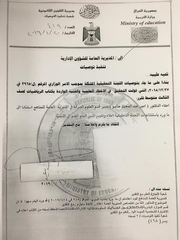 ونصت الوثيقة،أنه "بناءً على ما جاء بتوصيات اللجنة التحقيقية التي تولت التحقيق في الأخطاء العلمية والفنية الواردة بكتاب الرياضيات للصف الثالث متوسط، تقرر اعفاء امير عبد المجيد جاسم، مدير قسم العلوم الصرفة في المديرية العامة للمناهج استنادا الى ما ورد باستنتاجات اللجنة".
