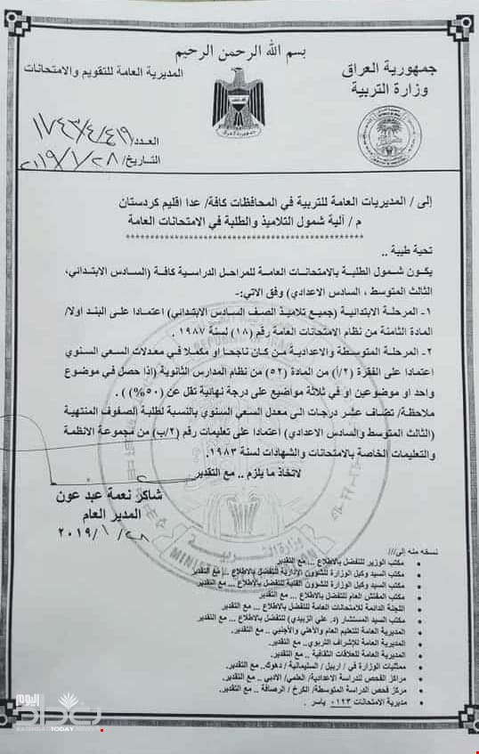اصدرت وزارة التربية، اعماما الى مديرياتها كافة، عدا اقليم كردستان، بشأن آلية شمول التلاميذ والطلبة في الامتحانات العامة للصفوف المنتهية.