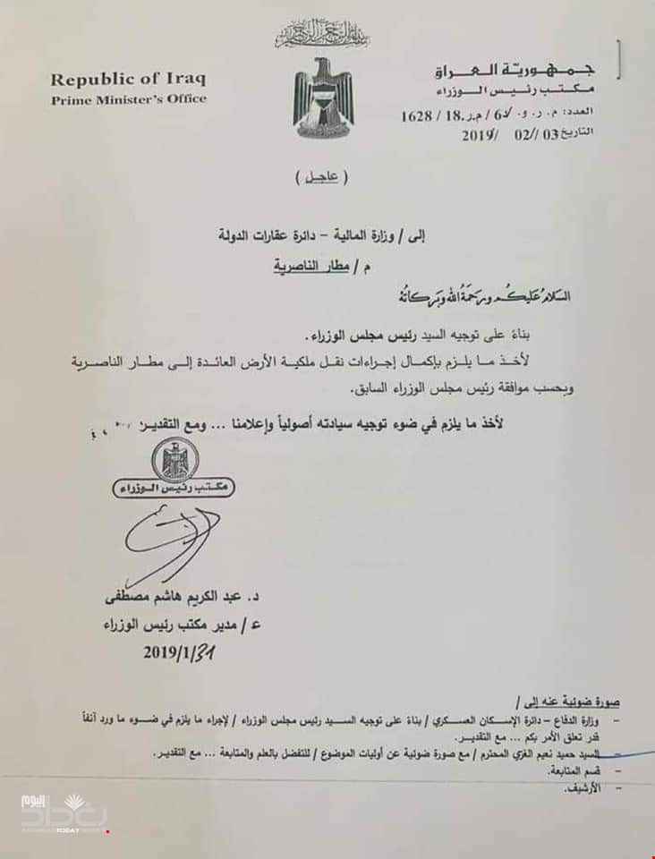 أصدر مكتب رئيس مجلس الوزراء عادل عبد المهدي توجيها بشأن ملكية ارض مطار الناصرية في محافظة ذي قار.