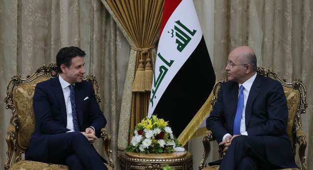 وقالت رئاسة الجمهورية، في بيان إن "رئيس الجمهورية برهم صالح استقبل في قصر السلام ببغداد، اليوم، رئيس الوزراء الايطالي جوزيبي كونتي والوفد المرافق له".
