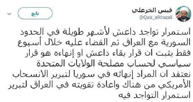 وقال الخزعلي في تغريدة على تويتر "نعتقد ان المراد إنهائه في سوريا لتبرير الانسحاب الأمريكي من هناك وإعادة تقويته في العراق لتبرير استمرار التواجد فيه".