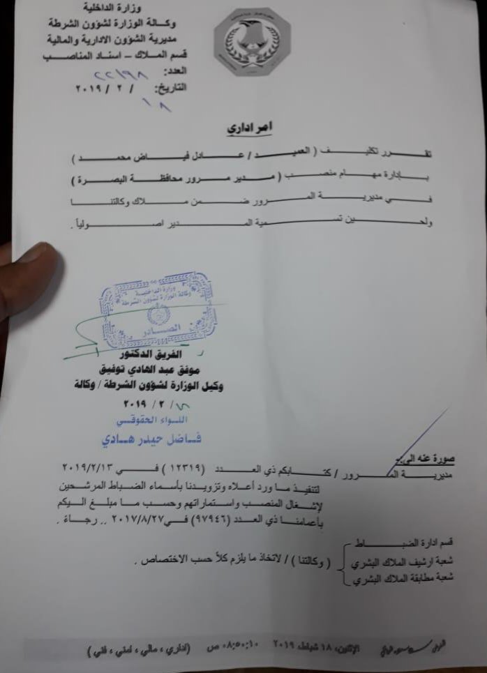 وجاء في الوثيقة أنه "تقرر تكليف (العميد عادل فياض محمد) بإدارة مهام منصب مدير مرور محافظة البصرة ضمن ملاك وكالتنا لحين تسمية المدير اصولياً".