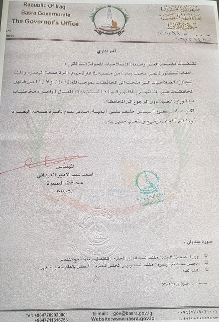 أفادت وثيقة صادرة بصيغة أمر إداري عن ديوان محافظة البصرة بإعفاء مدير دائرة الصحة وكالة وتكليف طبيب آخر ليحل محله بشكل مؤقت لحين انتخاب مدير جديد للدائرة من قبل مجلس المحافظة.