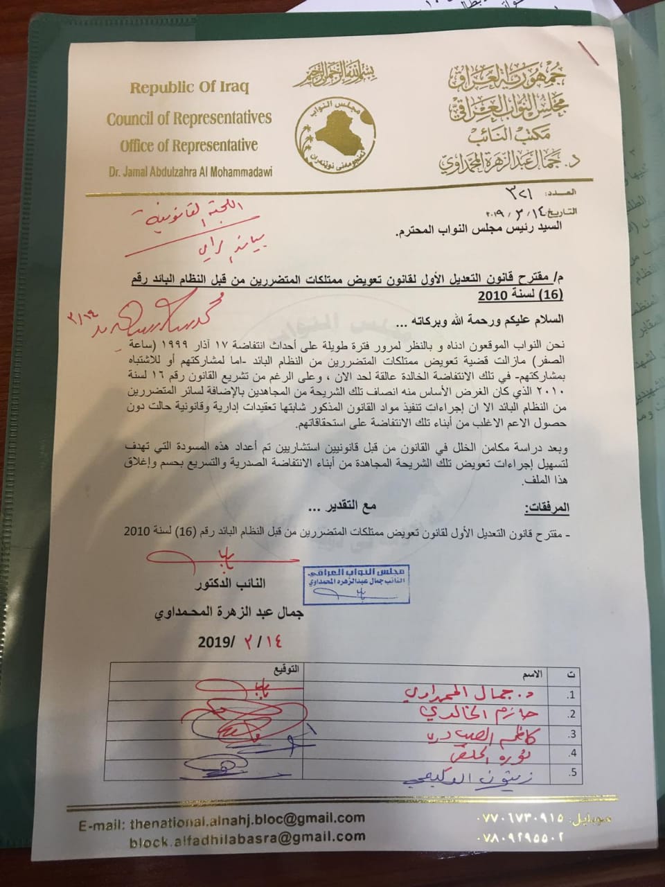 أعلن النائب عن كتلة "النهج الوطني" جمال المحمداوي، الخميس، عن تقديم مقترح قانون لتعويض ممتلكات المتضررين من قبل النظام السابق.