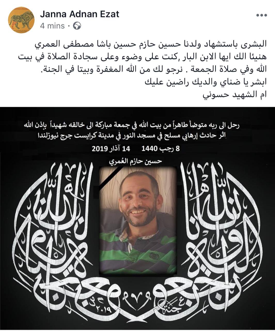 وقالت عزت في حسابها على فيسبوك ان ابنها "حسين توفي في الحادث الإرهابي بنيوزلندا امس".