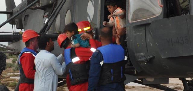وقالت المديرية في بيان إن "فرقنا من مركز رتل الطوارئ وبالتعاون مع طيران الجيش يتمكنون من انقاذ عائلة مكونة من اربع اطفال وامرأة كانوا محاصرين وسط السيول في منطقة الطيب بمحافظة ميسان".