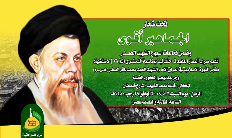 تحت شعار (( الجماهير أقوى )) وضمن فعاليات اسبوع الشهيد الصدر تقيم سرايا أنصار العقيدة احتفالية بمناسبة الذكرى الــ(39) لاستشهاد مفجّر الثورة الاسلامية في العراق الامام الشهيد السيد محمد باقر الصدر (قدس سره) وجريمة تهجير الكورد الفيلية