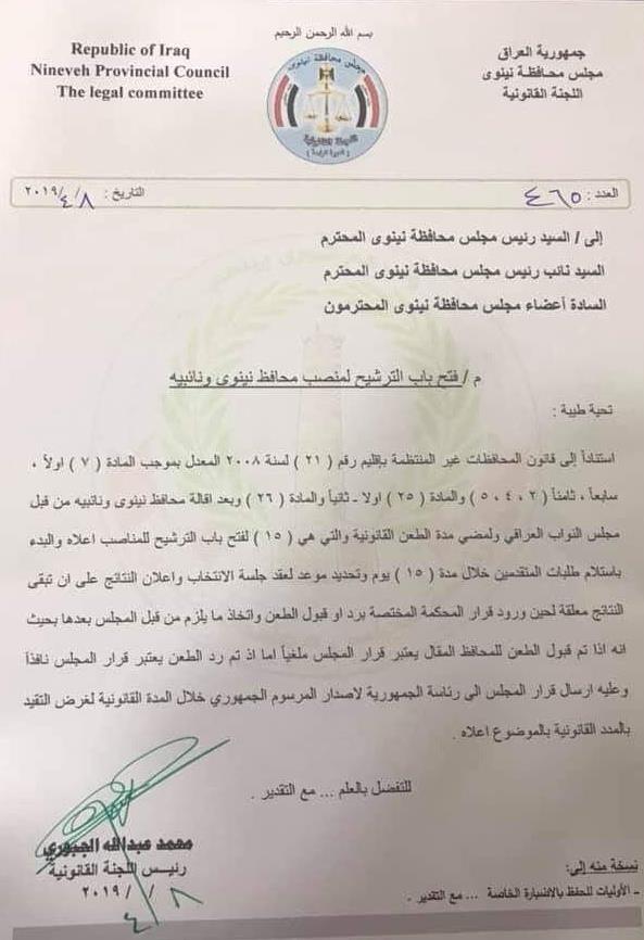 نشرت وثيقة صادرة من مجلس محافظة نينوى تتضمن فتح باب الترشيح لمنصب المحافظ ونائبيه.