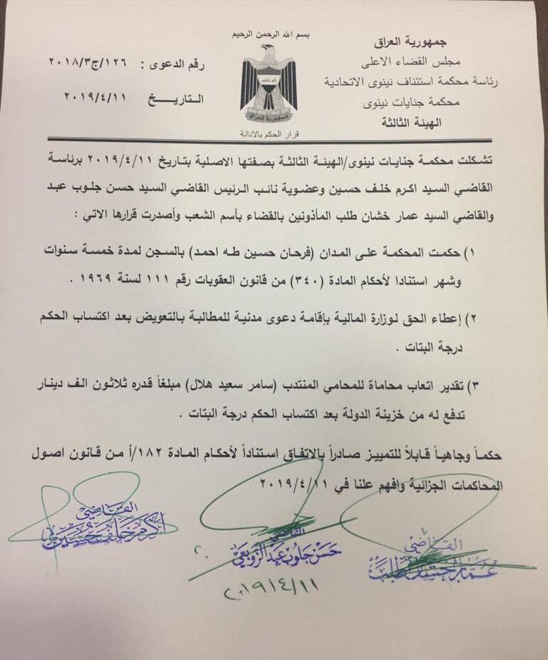 اصدرت محكمة جنايات نينوى حكما بالسجن لمدة خمس سنوات وشهر بحق مدير التسجيل العقاري في ايسر الموصل فرحان حسين طه.