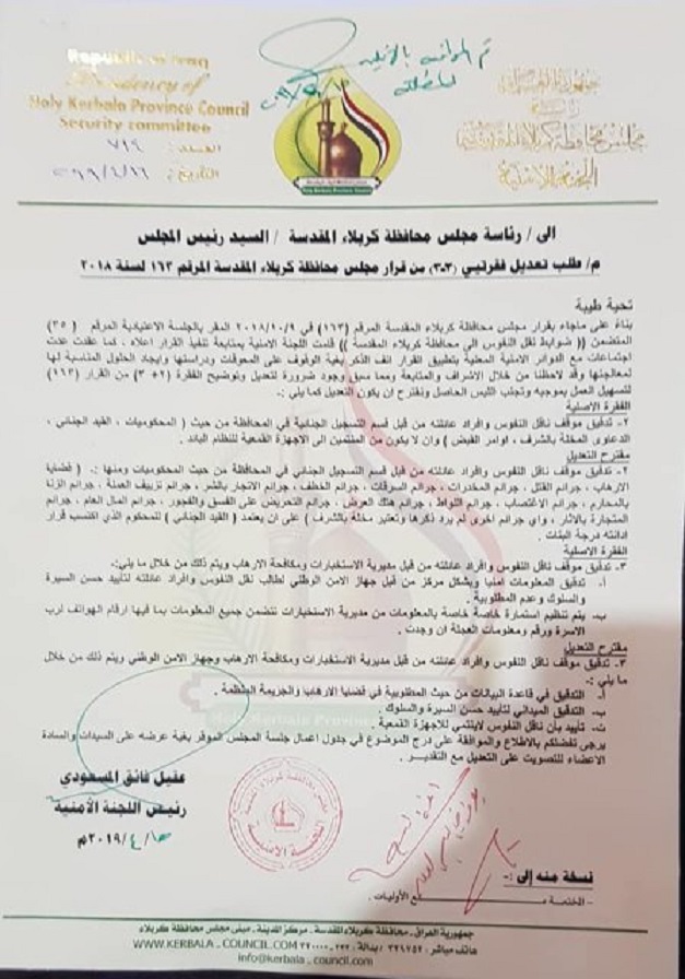 صوت مجلس محافظة كربلاء المقدسة في جلسته الاعتيادية لهذا اليوم الاربعاء، بالاغلبية المطلقة على طلب التعديل المقدم من قبل رئيس اللجنة الأمنية في المجلس عقيل المسعودي على فقرتي ( ٢ - ٣ ) من قرار مجلس المحافظة رقم (١٦٣) لسنة ٢٠١٨ الخاص بنقل النفوس، خصوصا بعد أن رصدت اللجنة الامنية كثير من حالات الظلم التي نالت الكثير من المواطنين أثناء مراجعاتهم لإنجاز عملهم في قسم التسجيل الجنائي ، بسبب تقيد قسم التسجيل الجنائي بالفقرة (٢) من قرار المجلس رقم (١٦٣) في مصطلحي ( المحكوميات ، والقيد الجنائي ) التي تم تحديدهما وتعريفهما من قبل المختصين في اجتماعات جانبية ومسبقة اجريت من قبل رئيس اللجنة الامنية مع المختصين من السادة مدراء الأجهزة الامنية ، بغية رفع الحيف والظلم عن كاهل المواطنين.