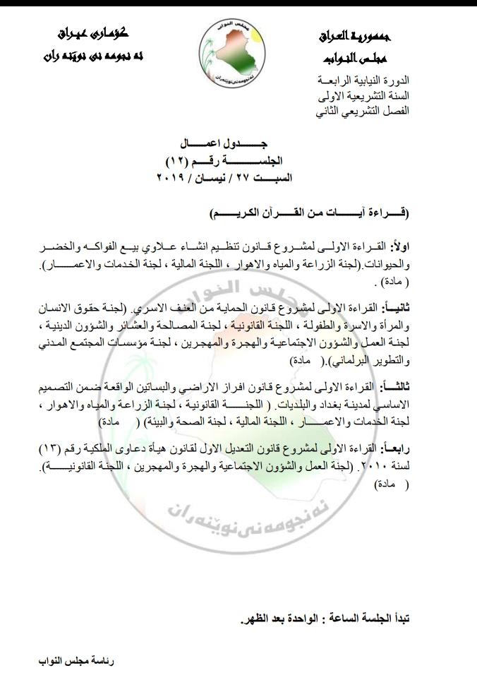 نشرت وثيقة توضح جدول اعماله لجسة السبت المقبل، فيما بينت الوثيقة أن جدول الاعمال يتضمن القراءة الاولى لقانون "الحماية من العنف الاسري".