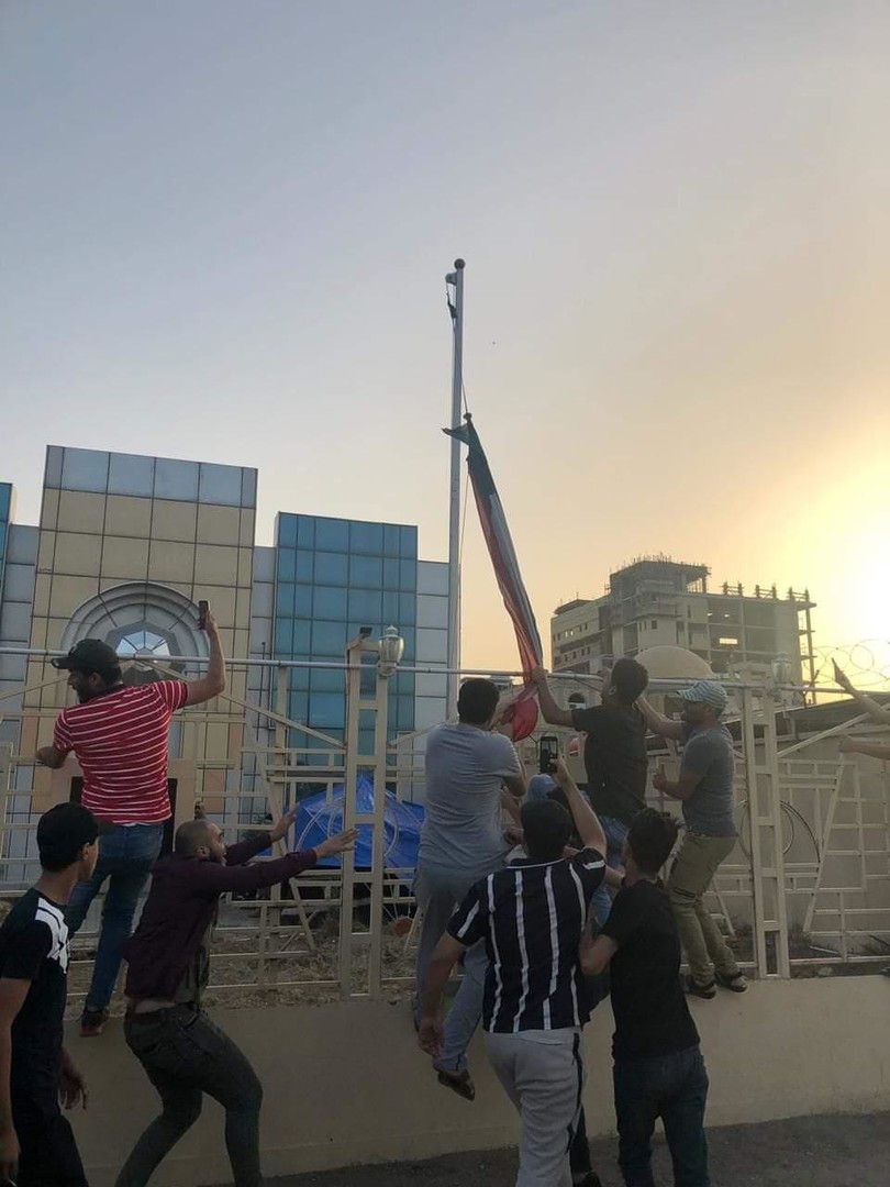 وأنزل المتظاهرون العلم من السارية عند مدخل القنصلية الكويتية في المحافظة قبل أن يعيدوه إلى مكانه قبل انسحابهم.