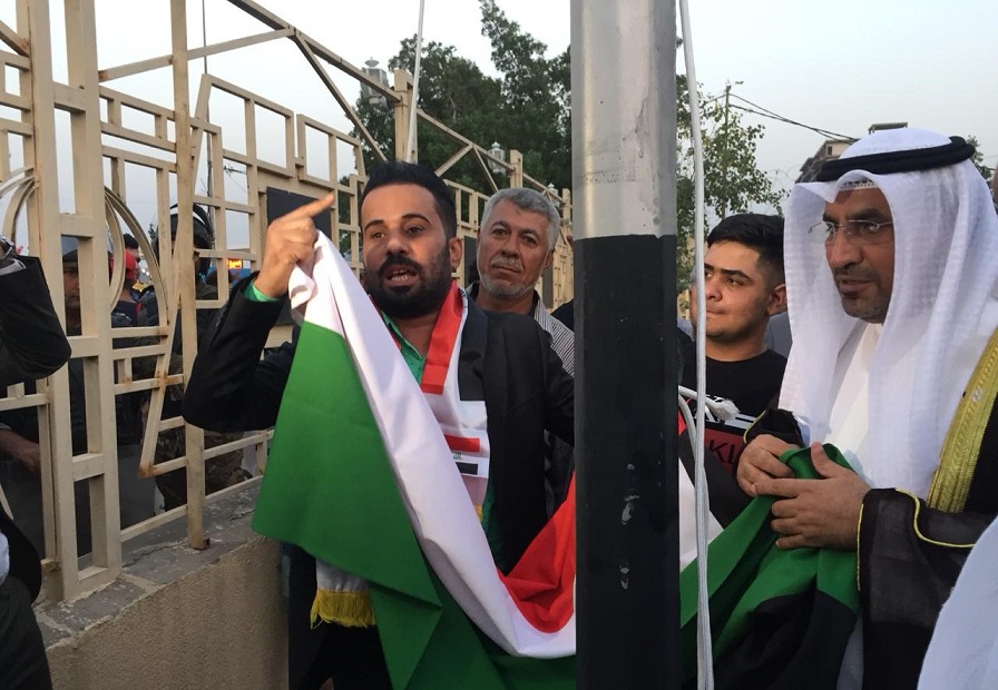 وقبيل رفع العلم، قدم عدد من متظاهري البصرة، باقة من الورد لموظفي القنصلية الكويتية.
