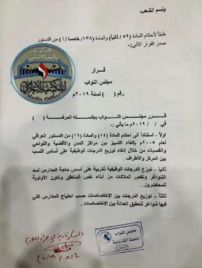 وبحسب وثيقة، حصلت عليها 'المدار'، انه ' أستناداً الى أحكام المادة (١٤) والمتدة (١٦) من الدستور العراقي لعام ٢٠٠٥م بإلغاء التمييز بين مراكز المدن والأقضية والنواحي والقصبات من خلال إلغاء توزيع الدرجات الوظيفية على أساس النسب بين المركز والأطراف'.