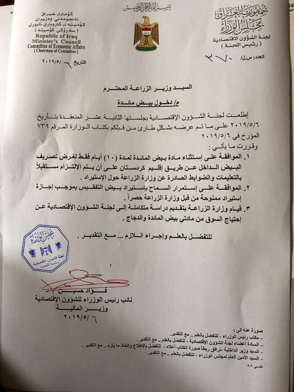 واضاف البديري، ان "ماحصل الان هو صدور كتاب بالموافقة على دخول البيض المستورد من اقليم كردستان لفترة معينة لارضاء اطراف معينة،