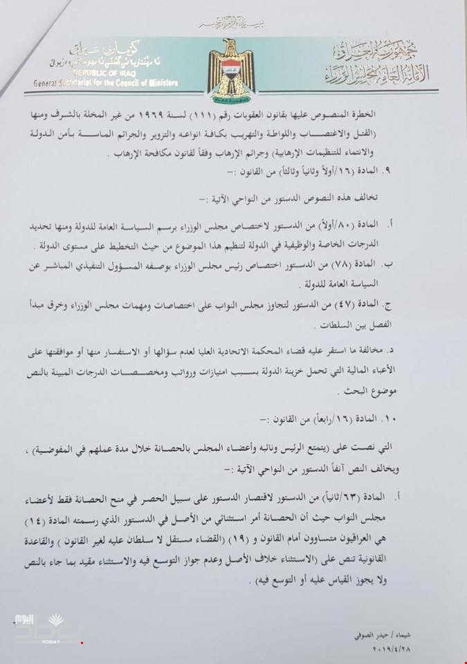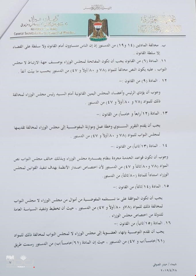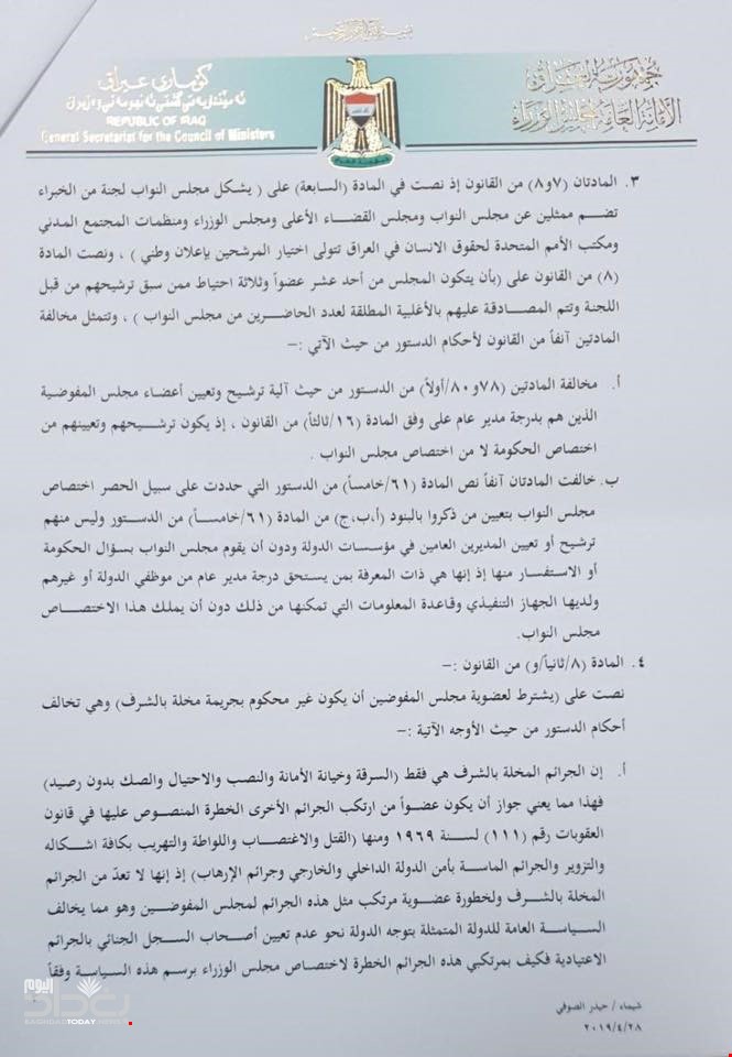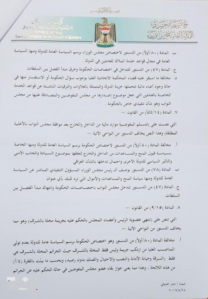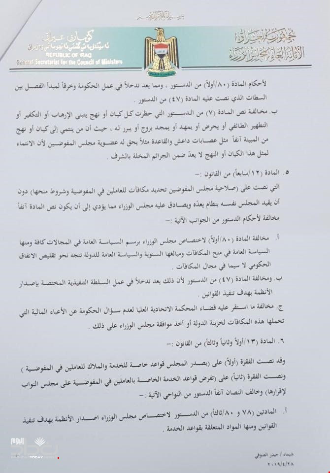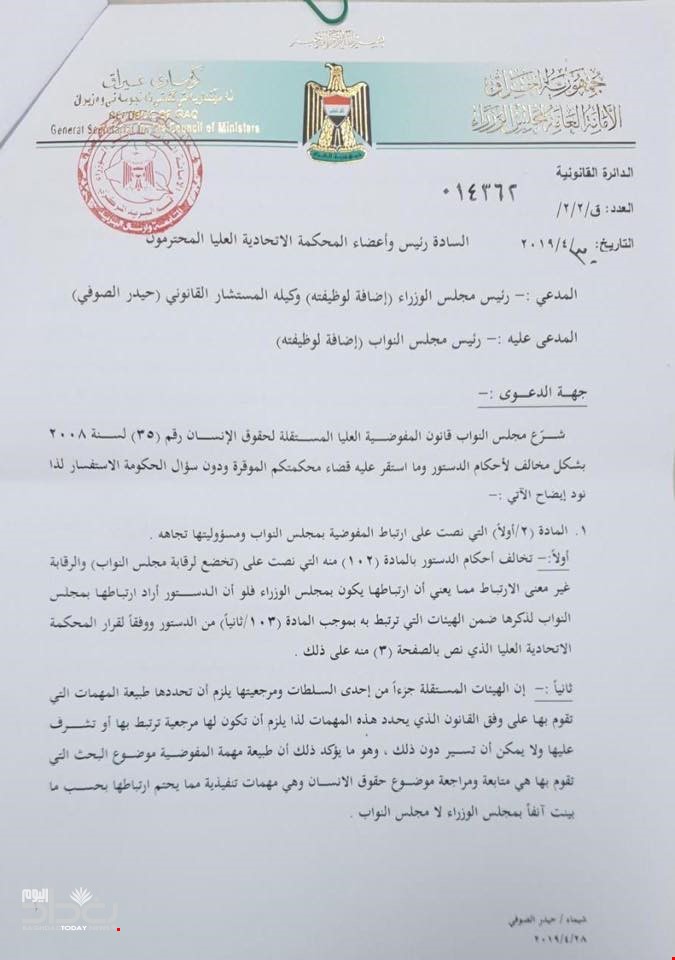 وبحسب الوثائق، الصادرة بتاريخ 30/ 4 2019، فأن الأمانة العامة لمجلس الوزراء وجهت كتابا الى رئيس وأعضاء المحكمة الاتحادية بخصوص قيام البرلمان بتشريع قانون المفوضية العليا المستقلة لحقوق الانسان رقم (35) لسنة 2008 بشكل مخالف لاحكام الدستور واستقر عليه قرار القضاء من دون سؤال الحكومة للاستفسار.