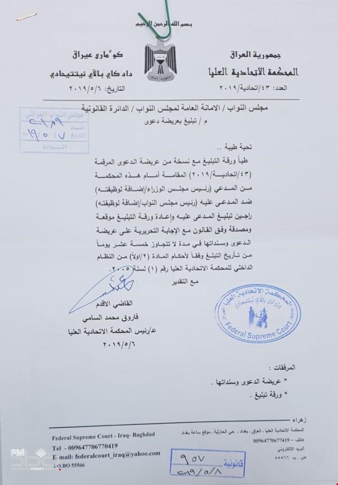الى ذلك، أرسلت المحكمة الاتحادية تبليغا بتاريخ (6 أيار 2019) الى رئاسة مجلس النواب، لغرض ابلاغ المدعي عليه رئيس البرلمان محمد الحلبوسي بالدعوى المقامة ضده من قبل رئيس مجلس الوزراء عادل عبد المهدي، مطالبة باجابتهم بكتاب موقع ومصدق من قبل رئاسة البرلمان وخلال مدة أقصاها 15 يوماً.