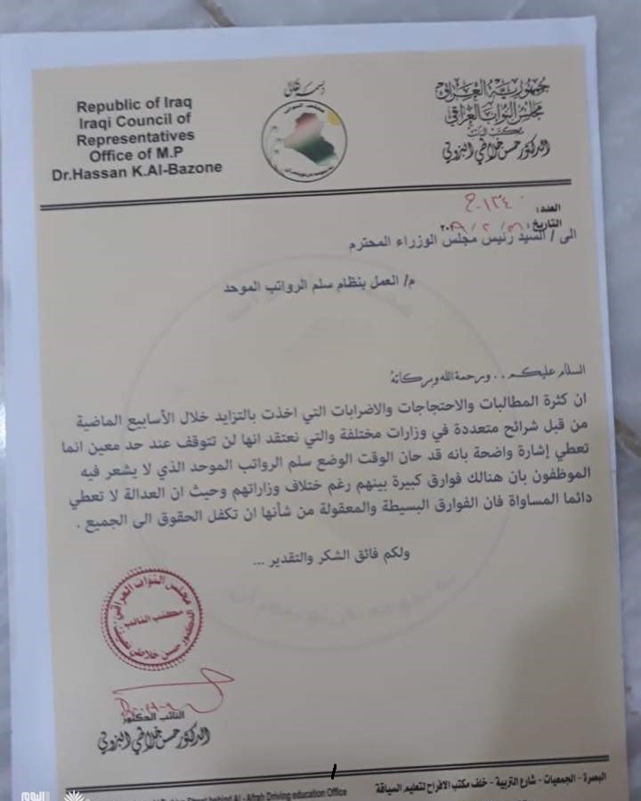 قدم النائب حسن خلاطي طلبا الى رئيس البرلمان محمد الحلبوسي للعمل بنظام سلم الرواتب الموحد في كافة الوزارات.
