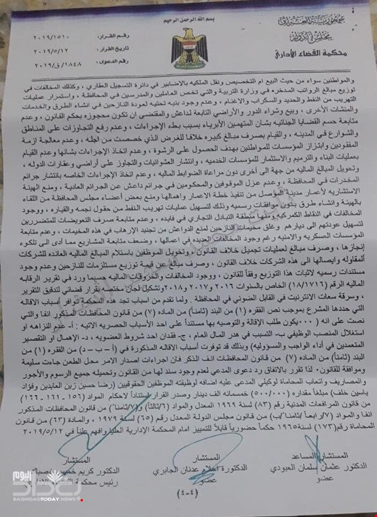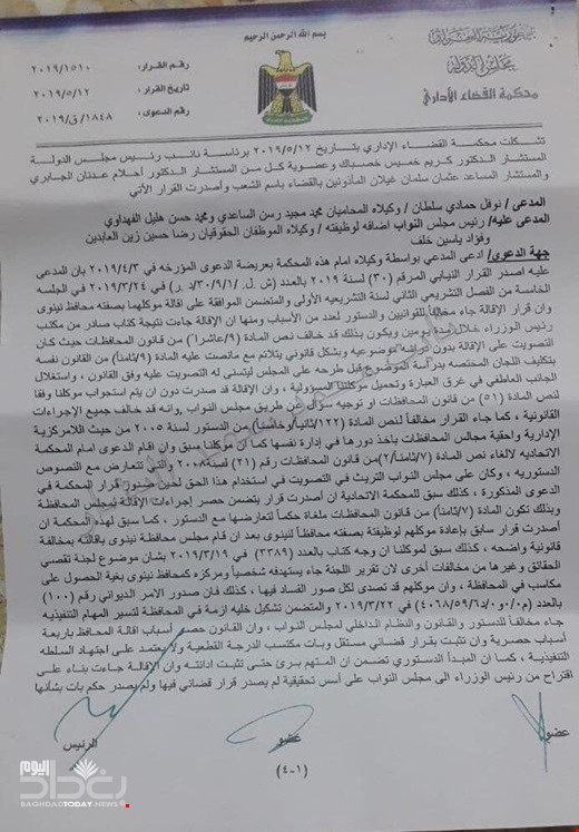 ونشرت وثائق نصت على مصادقة محكمة القضاء الاداري، على قرار مجلس النواب القاضي باقالة محافظ نينوى السابق نوفل العاكوب من منصبه بعد ردها لطعن تقدم به الاخير على قرار الاقالة.